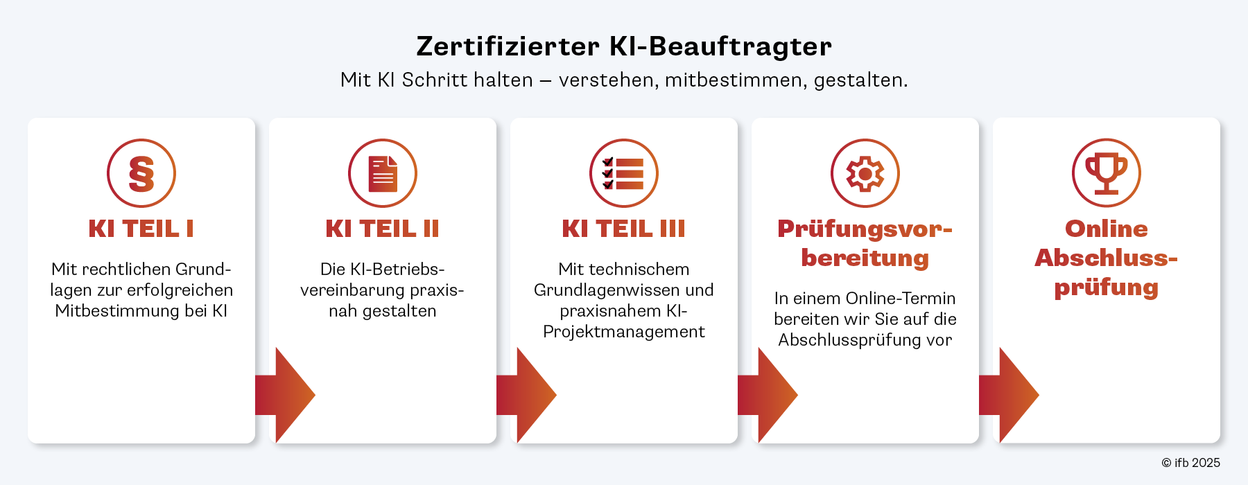 Die kostenfreie Abschlussprüfung absolvieren Sie ganz bequem online - flexibel, ortsunabhänging und in vertrauter Umgebung. Als KI-Beauftrager können Sie nun, mit Know-how und Souveränität den digitalen Wandel mit KI mitgestalten.