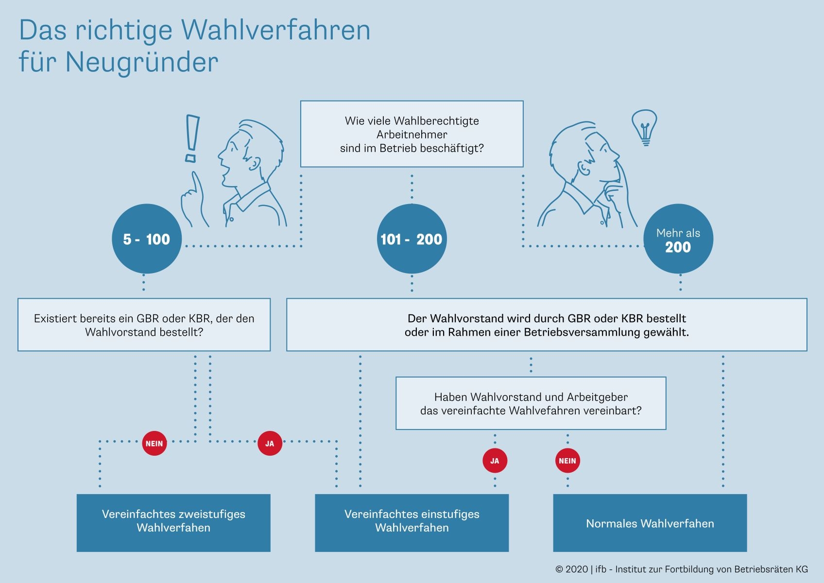 Wer sich rechtzeitig mit der Betriebsratswahl beschäftigt und diese gewissenhaft vorbereitet, wird auf mögliche Fehlerquellen schnell reagieren können. Neben der Lektüre von Fachbeiträgen sowie von speziellen Leitfäden zur Betriebsratswahl bietet sich insbesondere der Besuch von entsprechenden Seminaren an.